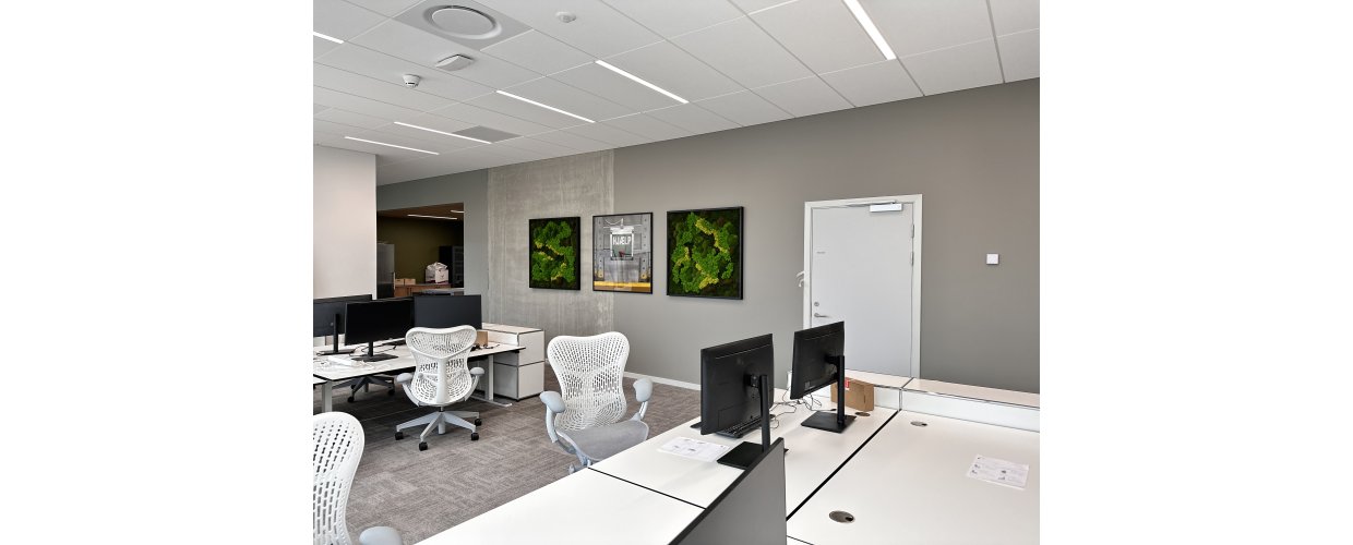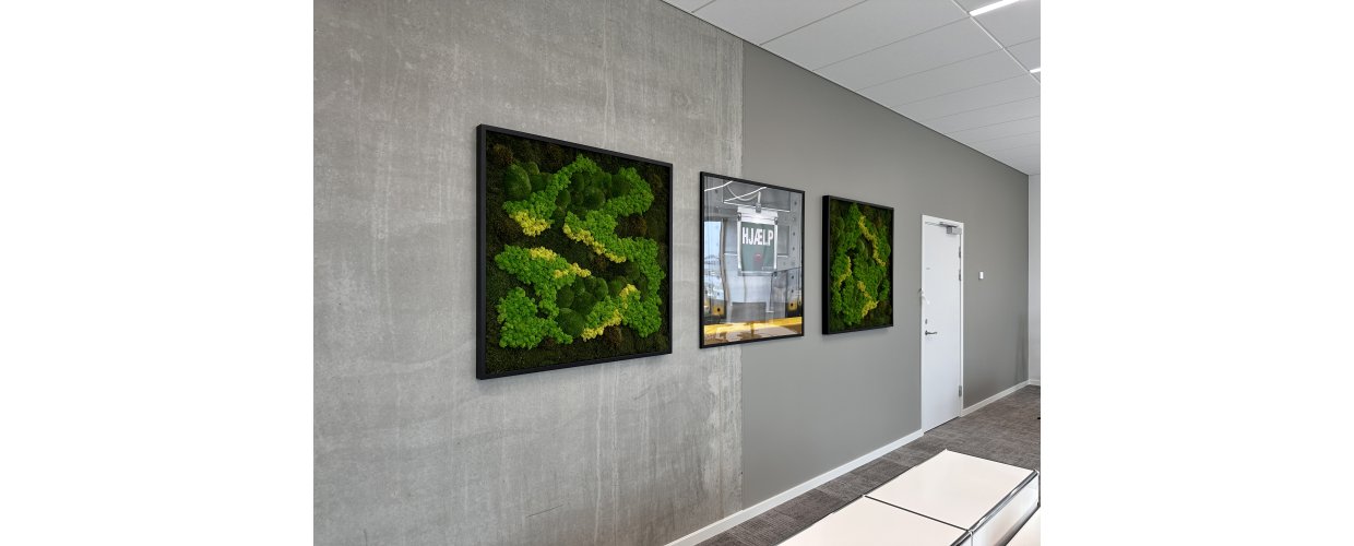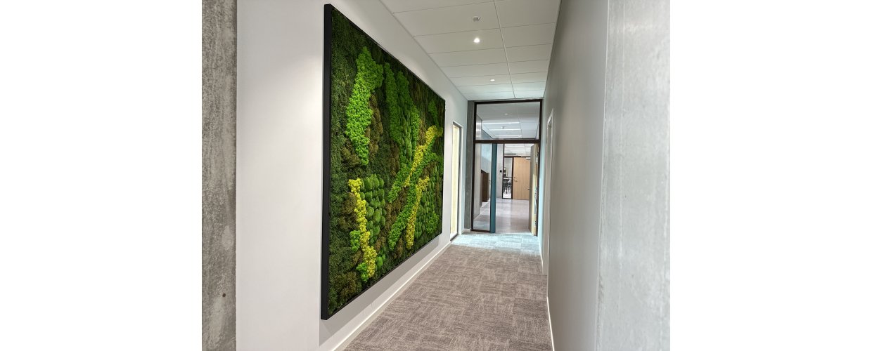 De valgte derfor et udvalg af vores mosvægge i et design skabt specielt til dem. På den måde fik de en løsning, der bidrog til både at visualisere deres grønne agenda samt skabe en bedre akustik og en unik æstetisk oplevelse, som hver dag er med til at gøre det behageligt at komme på arbejde.